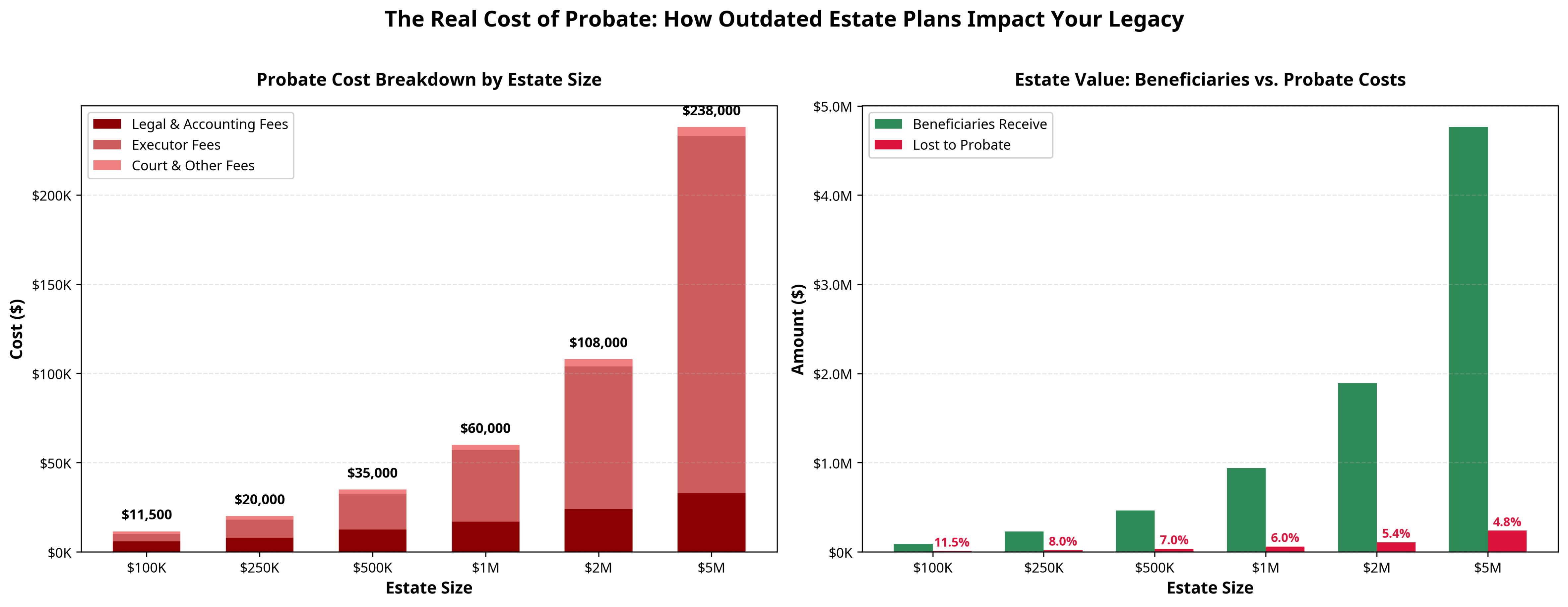 As the charts demonstrate, even a modest estate of $100,000 can lose over $11,500 to probate costs; that is 11.5% of the total estate value that will never reach your beneficiaries. For a $1 million estate, the costs can exceed $60,000, representing 6% of the estate.